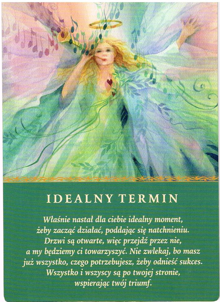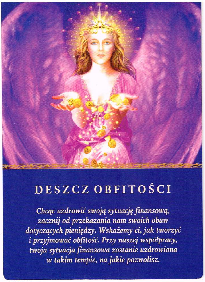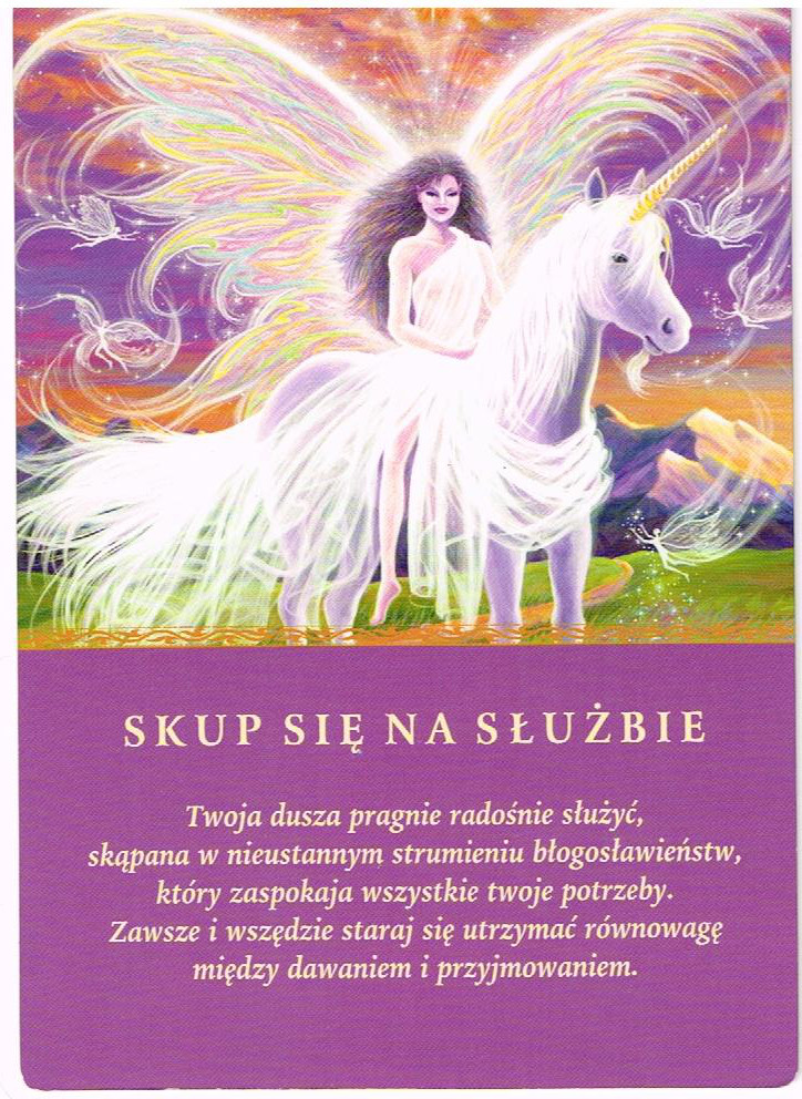 Anioły zesłały CI te kartę, ponieważ ostatnio proporcje miedzy dawaniem i przyjmowaniem zostały zachwiane. Jeśli dajesz znacznie więcej niż przyjmujesz, to prawdopodobnie czujesz, że inni wykorzystują Twoją życzliwość. Jeśli nierównowaga polega na tym, że więcej przyjmujesz niż dajesz, to być Mozę odczuwasz niepokój, przygnębienie, a nawet poczucie winy. Choć nie można każdego dnia idealnie równoważyć dawania i przyjmowania, można jednak zachować zdrowy balans. W tym celu pamiętaj, żeby codziennie dawać coś od siebie (cza, pieniądze, prezent lub komplement), nie oczekując niczego w zamian. Tego samego dnia z wdzięcznością przyjmuj niespodziewane propozycje pomocy, komplementy czy inne dary. Mów „dziękuję” bez zakłopotania czy poczucia winy. W relacjach, w których to Ty więcej dajesz, wyrażaj swoje potrzeby i proś o pomoc.