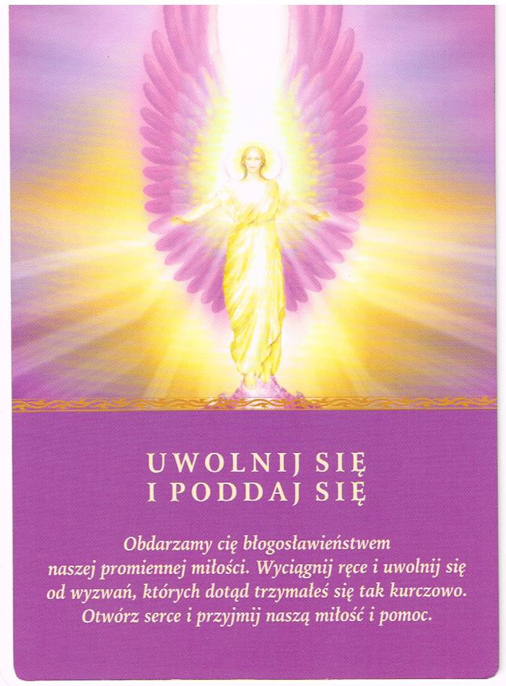 Anioły obdarzają Cię tą kartą, ponieważ usiłujesz poprawić swoją sytuację samodzielnie. Pragną Ci pomóc i spełnić Twoje modlitwy, ale najpierw musisz się poddać i uwolnić od tej sytuacji. Poddanie się wynika ze znużenia ciągłą walką. Przynosi emocjonalną swobodę i wiarę, ze boska mądrość Ducha ( również Twojego wyższego Ja) lepiej sobie poradzi. Poddanie się nie oznacza przegranej ani chęci oddania się czyjejś kontroli. Dzięki poddaniu się osiągniesz lepszy wynik. Jeśli potrzebujesz pomocy, poproś anioły, a pomogą Ci się poddać.