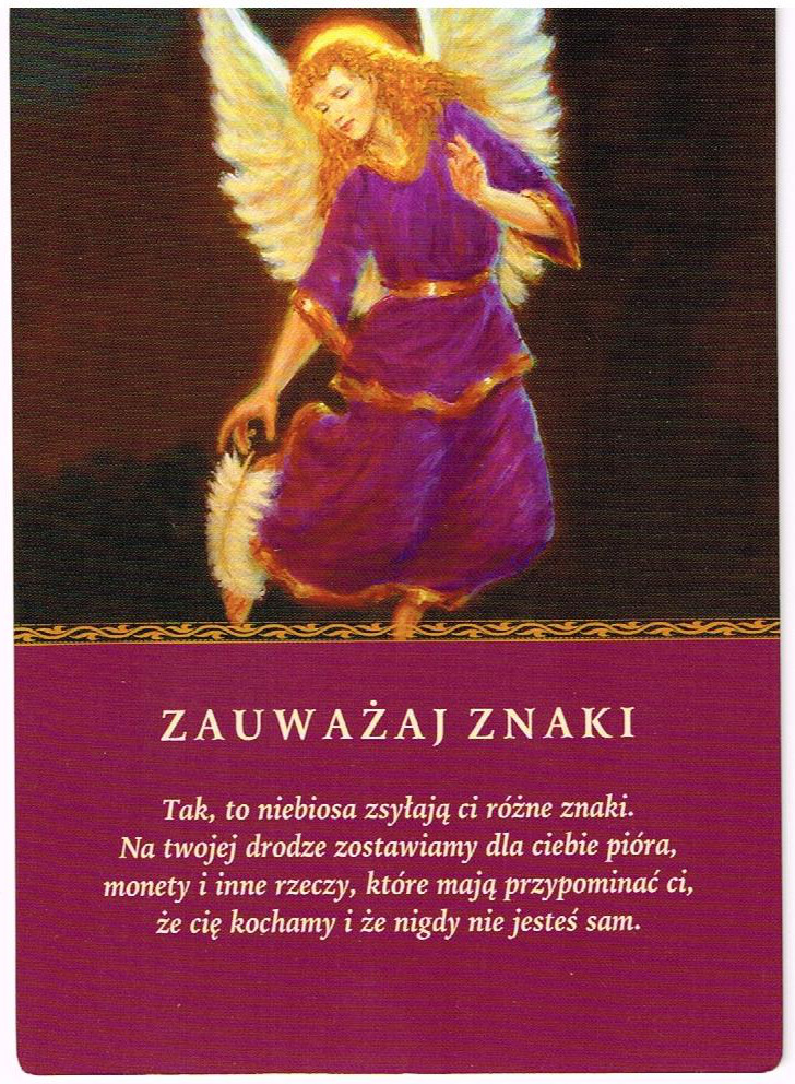 Anioły zesłały Ci tę kartę, żeby pomóc zrozumieć znaki, które ostatnio otrzymałeś. Mogły to być pióra, monety, motyle, ptaki i inne powtarzające się wizje, przywodzące na myśl anioły, które celowo zesłały te znaki, żeby przypomnieć o swojej obecności przy Tobie: o tym, że Cie chronią, kochają i prowadzą.