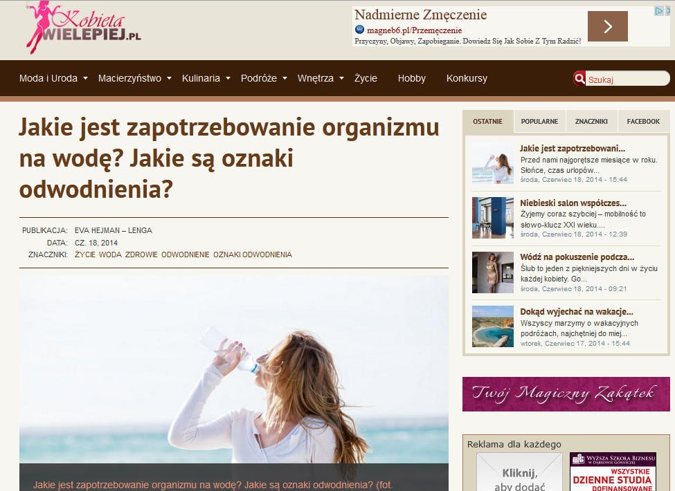 Jakie jest zapotrzebowanie organizmu na wodę? Jakie są oznaki odwodnienia?- Autorska publikacja na portalu internetowym "Kobieta Wie Lepiej" 18.06.2014r
