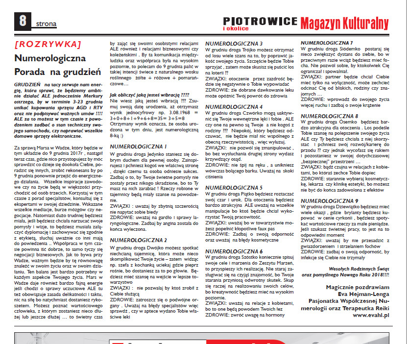 Numerologiczna porada na grudzień 2017r - Autorska publikacja na łamach gazety Piotrowicki Magazyn Kulturalny
